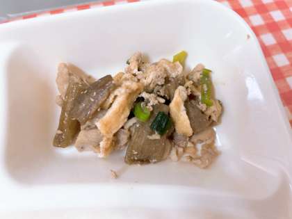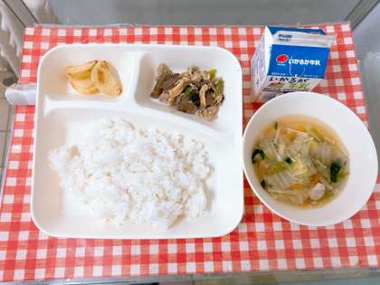 【豚肉と干しずいきのみそ煮、すまし汁、あげ焼きじゃが、ごはん、牛乳】
