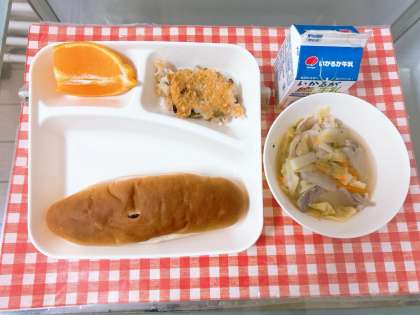 【2/20(火)押麦のグラタン、豚肉と野菜のスープ、デコポン、レーズンパン、牛乳】