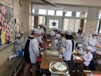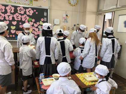 6年生に教わりながら、給食を配膳しました。お箸やストローもきちんと配れました。入れる量を食い入るように観察していました。