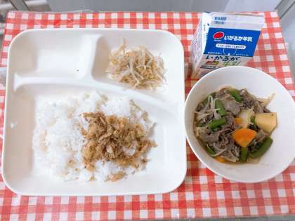 【みそ肉じゃが、もやしの甘酢あえ、ごまかかいため、ごはん、牛乳】