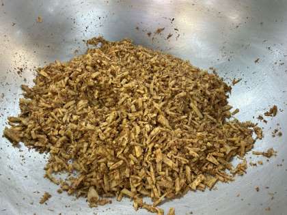 「ごまかかいため」は、下ゆでをしたたけのこを炒め、みりん、こいくちしょうゆを加えてさらに炒め、かつおぶし、いりごまを入れて仕上げます。ごはんによく合う1品です。