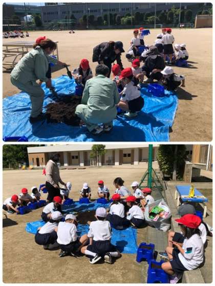 暖かい日差しをあびながら、1年生は植木鉢に土を入れて、あさがおの種を蒔きました。