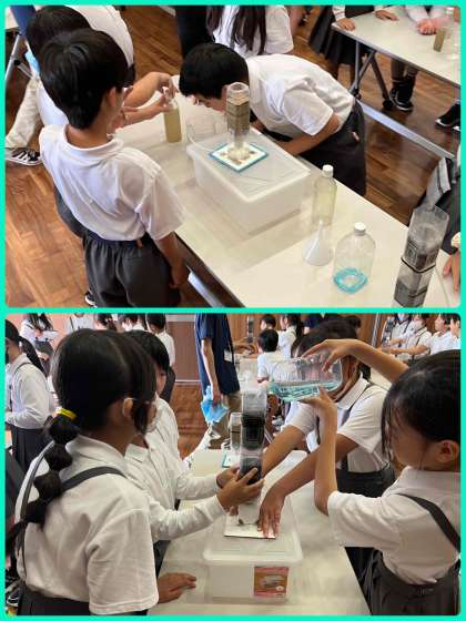 色がついた水を、急速砂ろ過と粒状活性炭で透明なきれいな水にする実験をしました。とうめいな水に変わって子ども達はびっくりしていました。