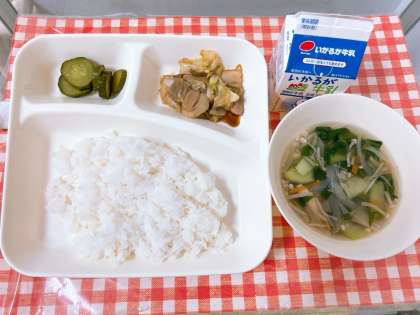 【ホイコウロー、中華スープ、きゅうりのピリ辛あえ、ごはん、牛乳】