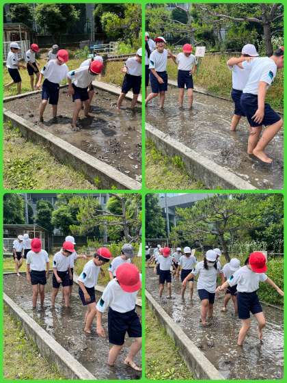 5年生のお米づくりの学習第2弾。『しろかき』に挑戦しました。来週の『田植え』に備えて水を張った田んぼの土を踏んで、土のかたまりを砕いてやわらかくしました。子ども達は、初めて裸足で田んぼの中に入った子も多かったようで、良い経験となりました。