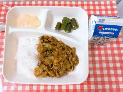 【和風カレー丼、オクラのかつお梅風味、和なし(缶づめ)、牛乳】