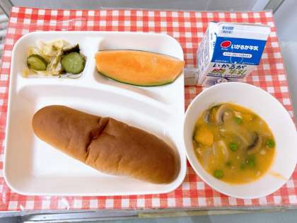 【鶏肉とかぼちゃのシチュー、ミックス海そうのサラダ、クインシーメロン、黒糖パン、牛乳】