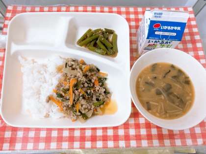 【豚ひき肉とにらのそぼろ丼、じゃがいものみそ汁、さんどまめのごまあえ、牛乳】