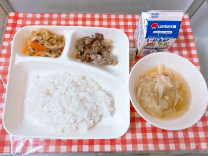 【豚肉のごまみそ焼き、すまし汁、切り干しだいこんのいため煮、ごはん、牛乳】