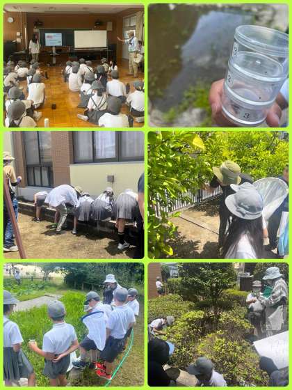 4年生が『生き物探し』をしました。茨田小学校の生き物の居そうな場所4地点を、4つのグループに分かれて行いました。子ども達はルーペを片手に、虫が居そうな場所を一生懸命に探していました。たくさんの講師先生方にも来ていただき、たくさんの植物や虫の名前を教えてもらいました。絶滅危惧種に指定されている『ヤスマツアメンボ』を発見して、「大阪市の小学校で初めて生息を確認しました!」と聞いた時は、子ども達も大喜びで大変盛り上がりました。最後に『生物多様性』についても学びました。