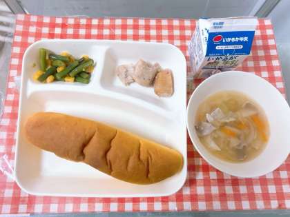【鶏肉のガーリック焼き、スープ、さんどまめとコーンのサラダ、パンプキンパン、牛乳】
