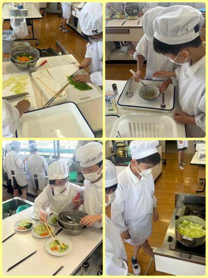 『カラフル野菜サラダ』作りをしました。3種の野菜を切って煮て、フレンチドレッシングを作ってできあがりです。みんなで協力して頑張っていました。「野菜が嫌い」と言っていた子も、自分達で作った野菜サラダはおいしかったようで、たくさん食べていました。