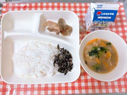 【鶏肉のてり焼き、みそ汁、魚ひじきそぼろ、ごはん、牛乳】