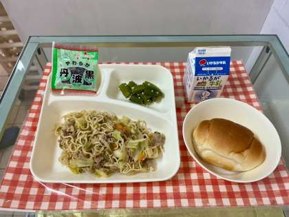 【和風焼きそば、オクラの甘酢あえ、ソフト黒豆、ミニコッペパン、牛乳】
