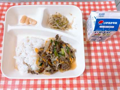 【牛丼、もやしとピーマンのごまいため、大福豆の煮もの、牛乳】