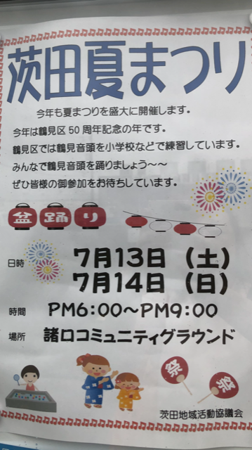 今週末は茨田夏まつりが諸口コミュニティグランドで行われます。テント下のお店は18時からですが、17時30分からの30分間は、茨田小学校のみんなでま〜るくなって楽しく踊りましょう。