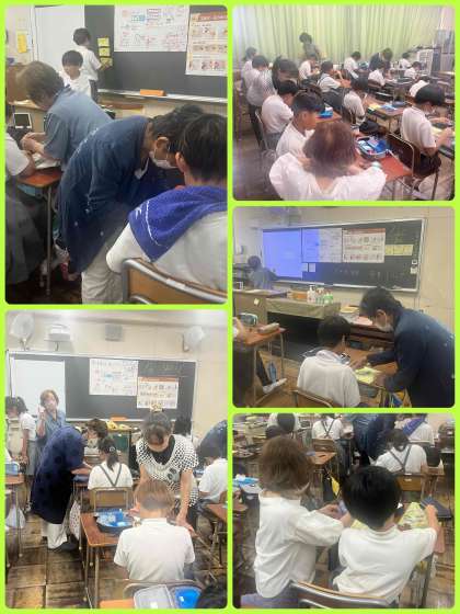 5年生の裁縫の学習に、ゲストティーチャーとして、地域生涯学習の方々に来ていただききました。たくさんの裁縫の先生方が居たので、『玉止め』や『玉結び』などひとりひとり丁寧に教えてもらうことができ、子ども達はうれしそうでした。