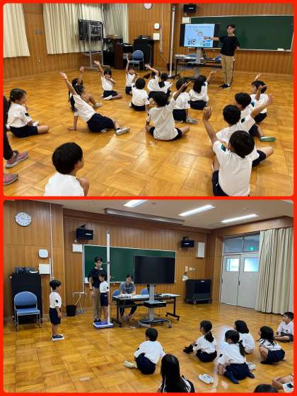 今日は1年生の保健指導と発育測定を行いました。保健指導では「あつさにまけずにすごそう」のお話をしました。暑い日が続きますが、熱中症にならないように早ね早起き・朝ごはんで元気に過ごしましょう!