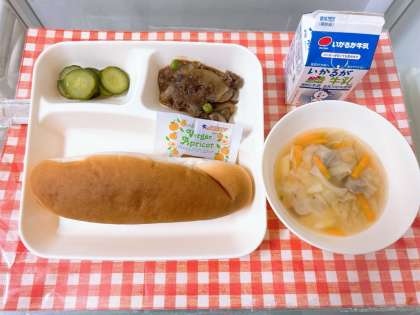 【牛肉のソース煮、スープ、きゅうりのピクルス、コッペパン、アプリコットジャム、牛乳】