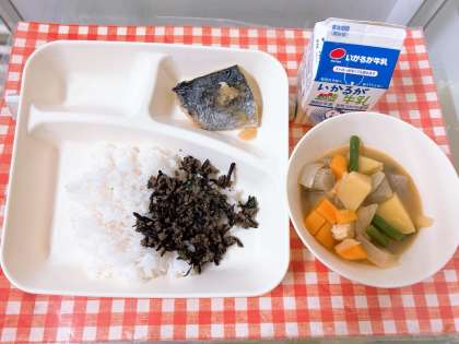 【さごしのおろしじょうゆかけ、含め煮、牛ひじきそぼろ、ごはん、牛乳】