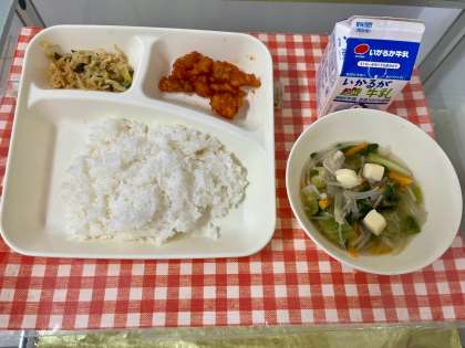 【ヤンニョムチキン、とうふのスープ、切り干しだいこんのナムル、ごはん、牛乳】