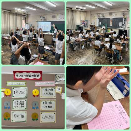 9月10日に2学期はじめての清潔検査を行いました。今回は1年2組がはんかち・ティッシュ忘れゼロのパーフェクト、3年2組がティッシュ忘れがゼロでした👏