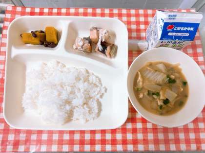 【さけの塩焼き、みそ汁、かぼちゃのいとこ煮、ごはん、牛乳】
