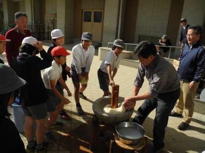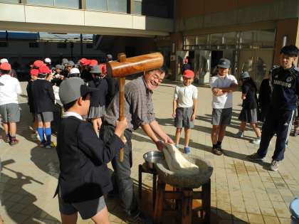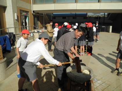 地域の方の協力で、もちつきをしました。このもち米は、5年生が田植えをして育てたものです。