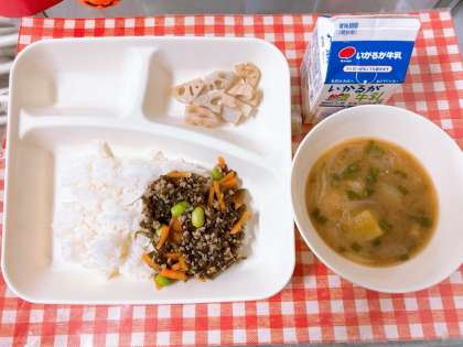 【もずくと豚ひき肉のジューシー、さつまいものみそ汁、焼きれんこん、牛乳】