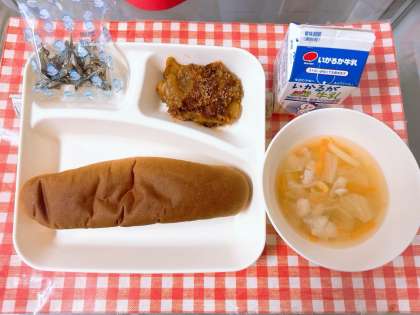 【なすのミートグラタン、鶏肉とキャベツのスープ、ミニフィッシュ、黒糖パン、牛乳】