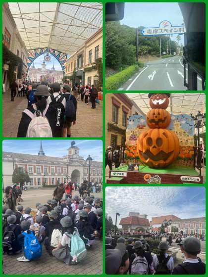 天理、嬉野と休憩を挟み,スペイン村に到着しました。バスではどちらの組もアカペラでカラオケなどして楽しんでいました。バスの中からスペイン村の看板やピレネーが見えた時は、歓声があがっていました。子ども達はワクワクした表情で班行動を始めました。