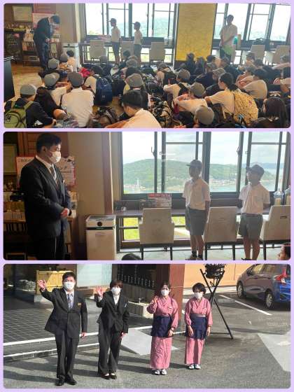 閉舎式を行いました。宿舎の方へみんなで感謝の気持ちを伝え、鳥羽水族館に向けて出発しました。