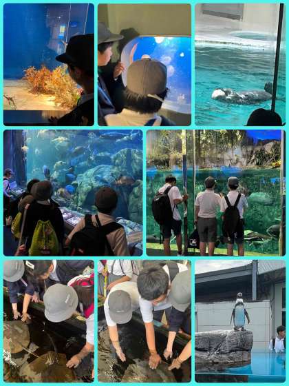 班行動で鳥羽水族館の見学を始めました。子ども達は色々な生き物に興味津々です。エイとタコを触ることのできるコーナーでは、キャーキャー言いながらふれあいを楽しんでいました。