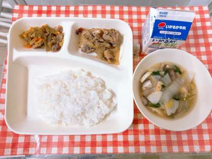 【鶏肉の梅風味焼き、うすくず汁、きんぴらごぼう、ごはん、牛乳】