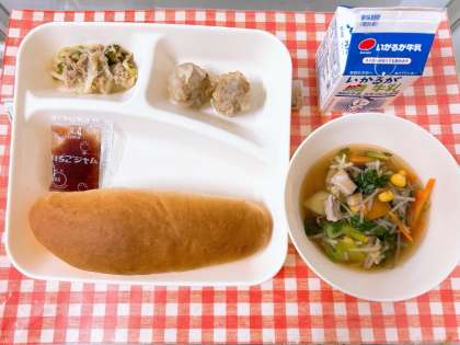 【焼きシューマイ、中華みそスープ、ツナと野菜のオイスターソースいため、コッペパン、いちごジャム、牛乳】