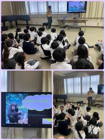 天王寺動物園よりゲストティーチャーとして飼育員さんに来ていただき、クイズを交えながら動物のことをたくさん教えていただきました。子ども達は興味津々で楽しそうに学習していました。話を聞くうちに、子ども達は、天王寺動物園に行きたくなっている様子でした。
