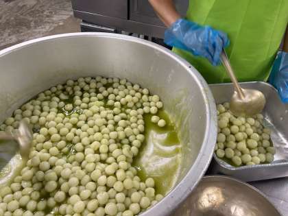 「まっ茶白玉のきな粉がけ」は、ゆでた白玉にまっ茶や砂糖でつくったタレと混ぜ合わせています。きな粉は、食べるときに各自でかけて食べます。