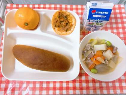 【豚肉と野菜のスープ煮、変わりピザ、みかん、黒糖パン、牛乳】