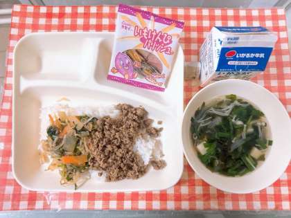 【ビビンバ、わかめスープ、いもけんぴフィッシュ、牛乳】