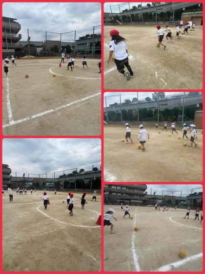 足でボールを扱うことが難しそうでしたが、子ども達はドリブルや『たまごわりゲーム』というシュートゲームをして、楽しく活動していました。