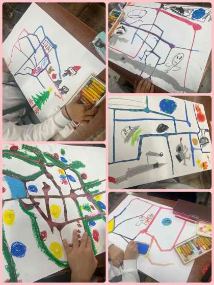 『絵の具をたらした形から』想像を働かせて絵をかきました。クリスマスツリーやプレゼントのお部屋、宇宙や乗り物など、様々なものに見立てて表現していました。子ども達の想像の豊かさにびっくりしました。