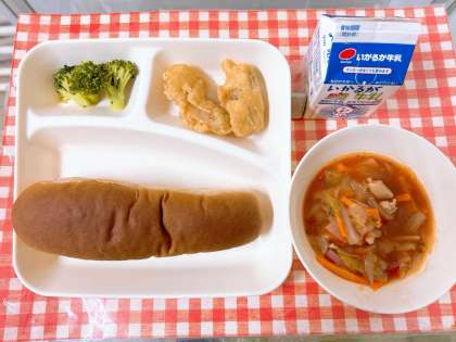 【白身魚フリッター、ミネストローネ、ブロッコリーのサラダ、黒糖パン、牛乳】