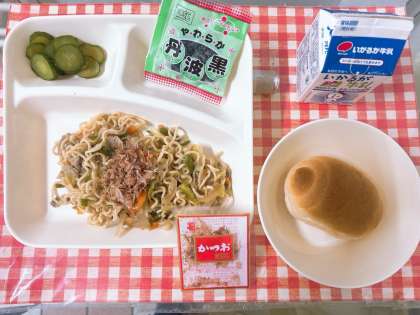 【和風焼きそば(かつおぶし)、きゅうりのしょうがづけ、ソフト黒豆、ミニコッペパン、牛乳】