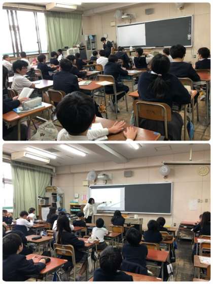 英語タイム。5年1組は音声に合わせて繰り返し発音し、5年2組は地図を見ながら道案内をしていました。