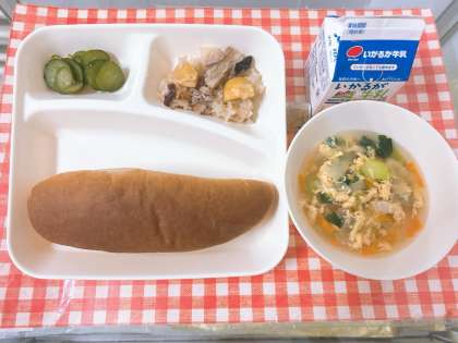 【中華おこわ、卵スープ、きゅうりのピリ辛あえ、黒糖パン、牛乳】