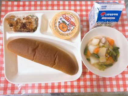 【きのこのドリア、鶏肉と野菜のスープ煮、みかんゼリー、黒糖パン、牛乳】