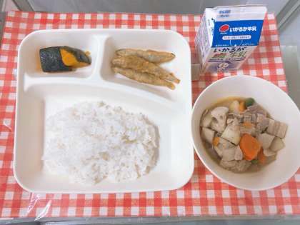 【きびなごてんぷら、含め煮、焼きかぼちゃの甘みつかけ、ごはん、牛乳】