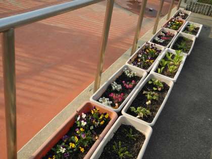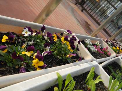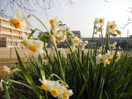 すくすくの森にスイセンがたくさん咲きました。また、年末に地域の方にいただいた、ビオラとアリッサムが元気に咲いています。