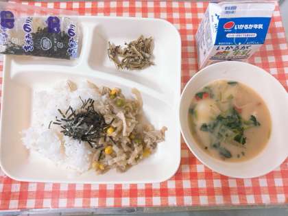 【れんこんのちらしずし、きざみのり、ぞう煮、ごまめ、牛乳】