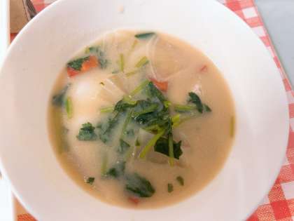 ぞう煮には、小さい丸いおもちが入っています。金時人参の赤色と、白みそ仕立ての白色、みつばの緑色で、色がきれいな汁ものでした。